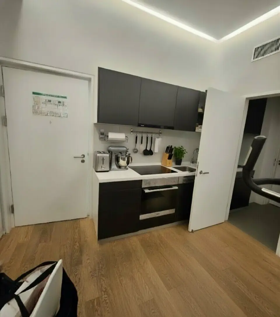 Das Wohn- und Esszimmer verfügt über eine hochwertige Innenausstattung, welche unter anderem einen maßgefertigten Einbauschrank sowie eine voll ausgestattete Einbauküche (Geräte der Firma Miele) samt eingebautem Esstisch umfasst. Das Bett ist räumlich durch einen Einbauschrank etwas abgetrennt.